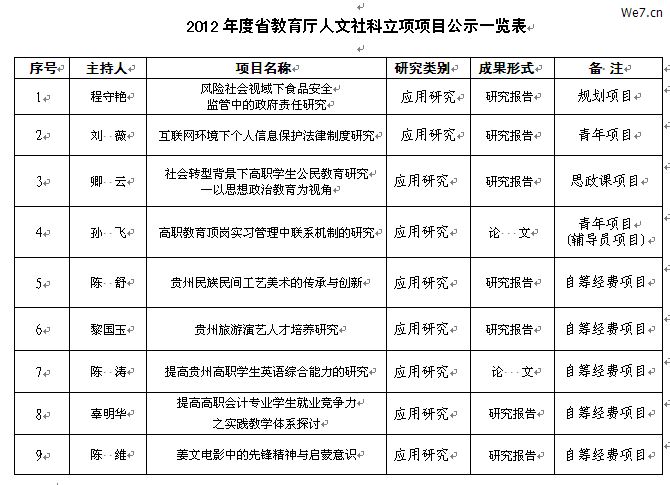 2012年,贵州职院科研处组织了省教育厅人文社科项目的申报。按教育厅限额申报的原则,校学术委员会初评推荐申报项目10项,经教育组织专家评审,我校9项申报课题获准立项,其中规划项目1项、青年项目1项、辅导员项目1项、思想政治课项目1项、自筹项目5项(立项项目见下表)。