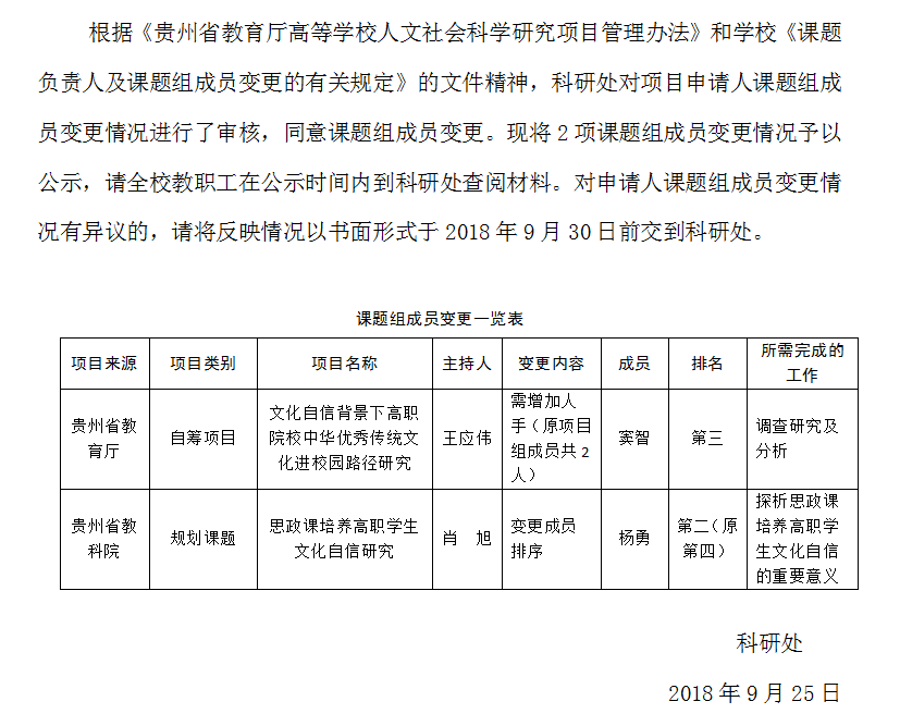 贵州广播电视大学(贵州职业技术学院)关于课题组成员变更情况公示