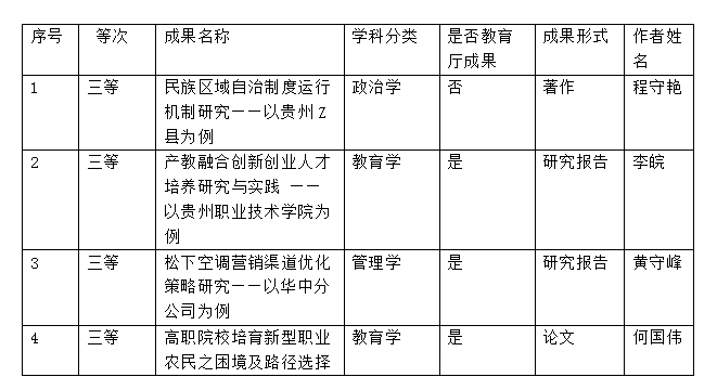 据悉,第四届贵州省高校人文社会科学研究优秀成果奖共有205项,其中一等奖39项,二等奖65项,三等奖101项。