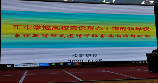 25日最后一天,由贵州师范大学副校长教授欧阳恩良给大家讲授了题为“牢牢掌握高校意识形态工作的领导权—兼谈新冠肺炎疫情下社会思潮的新动向”给我们科研工作人员解疑释惑,尤其是在科研工作中把握意识形态审查,提高认识意识形态工作的极端重要性,意识形态的概念辨析,西方意识形态建设的基本特征,改革开放以来我国社会思潮的总体特征,重点教授了盛行的几种思潮特点。案例丰富,讲解深刻,会后引起大家强烈反响。