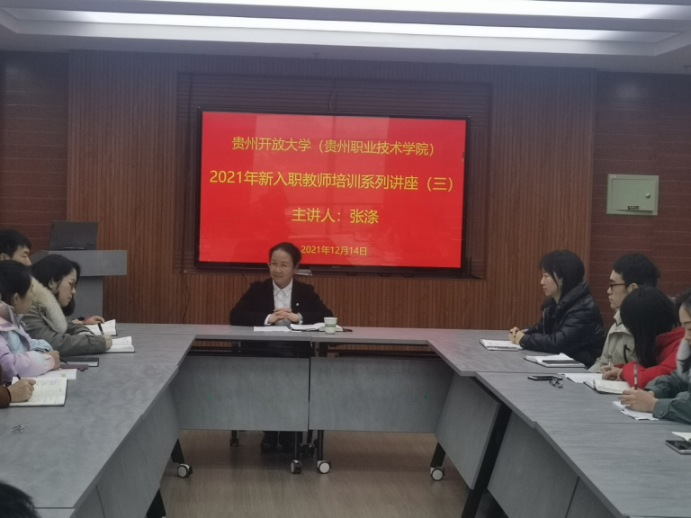 张涤处长在学校工作三十余年,她结合自身经历,生动地为新教师介绍了学校教育教学工作的性质、特点和任务,以及学校的校史校情、发展现状和发展规划,让新入职教师们对学校有了更全面的认识。张处长同时强调了青年教师科研工作的重要性,简要地解读了《贵州开放大学(贵州职业技术学院)科研项目管理办法(试行)》《贵州开放大学(贵州职业技术学院)科研成果转化管理实施办法(试行)》等文件规定,让新进教师们在了解目前学校科研方面具体情况的前提下,更有效地规划自身的科研工作计划。