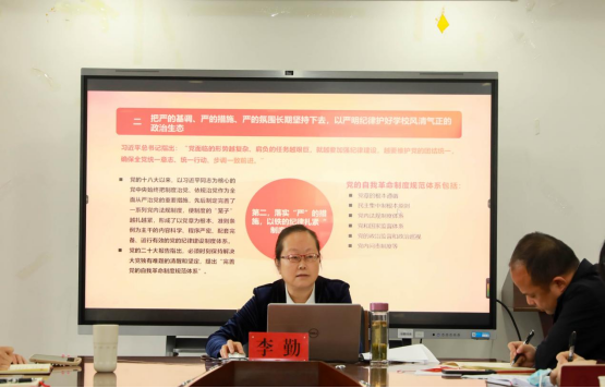 李勤以“坚持严的基调,勇于自我革命,在新征程上推进全面从严治党”为主题,通过违规违纪的真实案例,以案明纪、以案说法。她强调,管党治党一刻也不能放松,决不能有松劲歇脚、疲劳厌战的情绪,更不能有降调变调的错误期待;要把严的基调、严的措施、严的氛围长期坚持下去,以严明纪律护好学校风清气正的政治生态;全面从严治党,要坚持问题导向,保持战略定力,勇于自我革命,永远吹冲锋号。