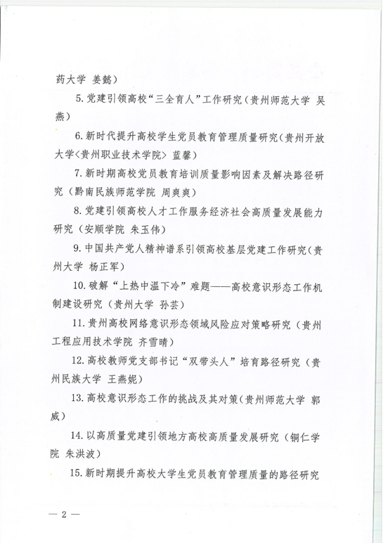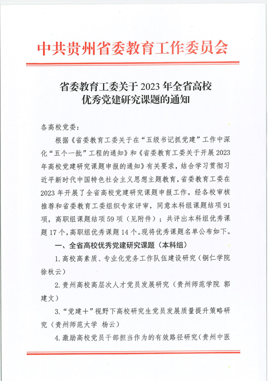 近日,贵州省委教育工委发布了关于2023年全省高校优秀党建研究课题的通知,共评出本科组优秀课题17个,高职组优秀课题14个,我校课题负责人蓝馨主持的《新时代提升高校学生党员教育管理质量研究》课题成功获得本科组优秀课题。