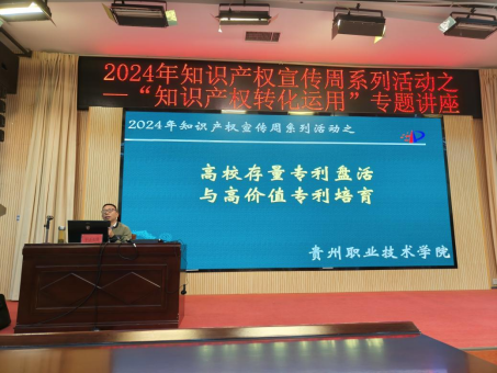 知识产权宣传周系列活动之“知识产权成果转化运用”专题讲座,于2024年4月24日下午在图书馆二楼学术报告厅举行,由贵州省知识产权局专家王曰洪主讲,各学院师生聆听了讲座。