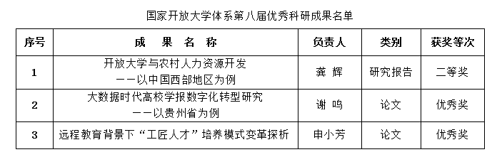 根据《关于开展国家开放大学办学体系第八届优秀科研成果评选活动的通知》(国开研〔2018〕4号),各分部共推荐参评成果212项,经管理办公室资格审查、专家评议和校领导审批,现确定获奖成果102项(名单见附件):其中一等奖7项、二等奖21项、三等奖25项、优秀奖49项,我校共申报6项,3项获奖。