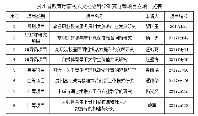 省教育厅组织专家对各类申报项目进行了的严格评审,我校共有8个项目获2017年度高校人文社会科学研究项目立项资助。其中规划项目1项、青年项目(辅导员项目)2项、思政课项目1项、自筹经费项目4项,请课题负责人按照《贵州省教育厅高等学校人文社会科学研究项目管理办法》要求开展研究工作,按时按质完成项目结项。