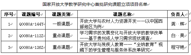 2014年2月,国家开放大学面向各分部、校内各部门组织国家开放大学教学研究中心首批研究课题的申报工作。此次申报,共收到国开总部和各分部提交的申报课题211项。经专家评议和审定,现确定91项课题获准立项,其中重点课题54项,一般课题37项。我校共申报4项课题,3项课题获准立项。