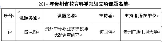 根据《省教育厅办公室关于组织实施2014年贵州省教育科学规划课题申报工作的通知》(黔教办科〔2014〕298号),贵州省教育科学规划领导小组办公室组织开展课题评审立项工作,共评出立项课题334项。其中,重点课题67项,一般课题224项,青年课题43项。我校申报了3项课题,1项课题获准立项。