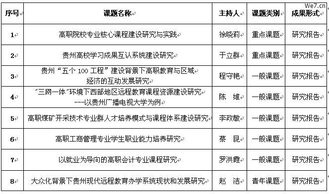 2013年,科研处组织申报的首届贵州省教育科学规划课题,经贵州省教育科学规划领导小组专家评审,8项申报课题获准立项,其中重点课题2项、一般课题5项、青年课题1项。