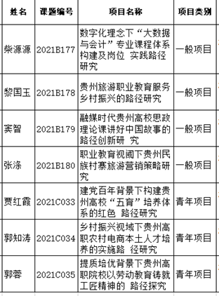 根据《省教育厅关于印发<2021年省教育科学规划课题申报工作方案>的通知》(黔教函〔2020〕363号)精神,科研处积极组织项目申报,上报15项项目。经贵州省教育科学规划课题评审委员会立项评审,学校获准立项4项一般项目,3项青年项目。请项目负责人遵照《贵州省教育科学规划课题管理细则》规定,认真开展研究工作,按时按质完成项目研究。